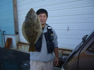 そして帰り道、四朗氏から「アタってるでー!!」とTELが有り、 急いで帰ると(( ̄ー+( ̄ー+( ̄ー+( ̄ー+( ̄ー+ ̄)ー+ ̄)ー+ ̄)ー+ ̄)ー+ ̄)ニヤニヤニヤニヤニヤ〜リ 糸を張り、見ていると確かにアタっている。すかさずアワセるとチョット小さいがヒラメをGET! しばらくして 四朗氏が「アタってる!!」又、当たりを見てなかった(><)