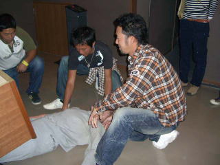 震源地の防災通りに到着すると、今度は「かじさん宅」が火事です。ここは井上君と僕とで消火