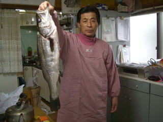 「がツン」とアワセると行き成り竿がのされそうに成り、やっと目が覚め!何とかやり取りをし魚を浮かせると、でかいスズキです。