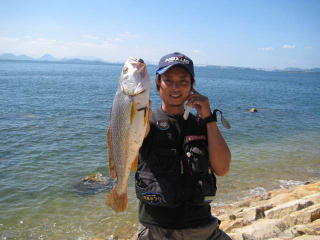 しかし満潮に成るにつれ潮はかなり早い、まず最初に野口君がイシモチ35cmを釣り上げた!