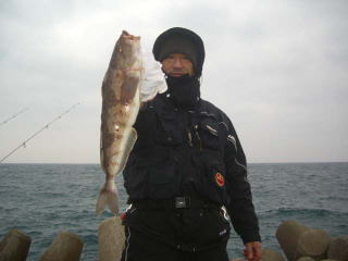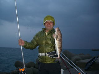 大宮君の25魚種達成が掛かっているので、タモで掬い「おめでとう!!!」と波止に上げると、