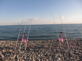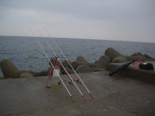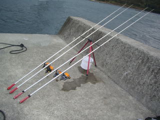 磯竿が三脚に3本、しかし仕掛けは上がっている・・・ルアーマンが1人・・・???
