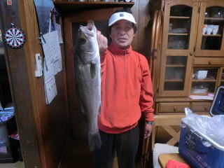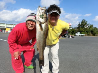 偶然?奇跡?と大笑いするスズキ75センチが副会長に釣れるものの