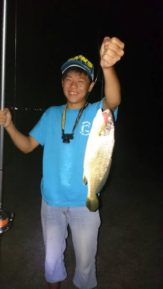 夕方を向かえ「ボチボチやな!」と竿先を見ていると「ジィーーー!!!」と息子の竿にアタリがありコトヒキ33cm登場!