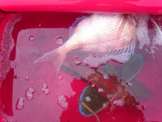そして、昼過ぎに、待望のアタリ!狙いどおり?のマダイをゲットしました〜(^O^)/