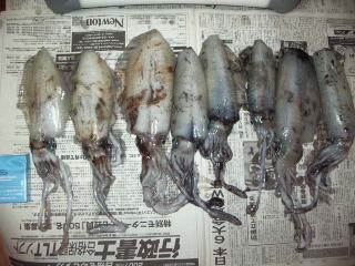 すると第一投目からドシッ☆!!胴長18cm! うっしっし(^^) なかなか幸先の良いスタートだ! 瀧井氏はライントラブル、おまけに片岡兄弟が 初エギングをするとの事で面倒を見ている。 今がチャンス!とばかりに誘いをかけるがなかなか乗らない。 この日は晃君がアカイカを3杯ゲット!瀧井氏がアカイカ2杯、会長○ボ(><) 次の日、磯の投げ釣りの合間に(竿は借りました)・・・ 何と!!(祝)初キロupGET!胴長31cm(1050g)! それからイカを釣るものの、リリースサイズばかり。 でもエギングを始めて初のキロupが出て満足の行く釣行でした。 |